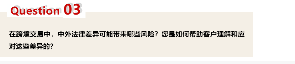 答:跨境交易中,中外法律差異潛藏一定風(fēng)險。例如,香港法律沒有集體訴訟制度,美國則有集體訴訟制度,這要求中國律師須深入了解境外法律。此外,特定國家法律程序與辦案方式側(cè)重點不同,需進一步結(jié)合當(dāng)?shù)厍闆r作出辦案方式的選擇。